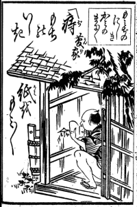 江戸時代末に出版されたと考えられる「地口絵手本」(作者:梅亭樵父)という書物があります。この「地口絵手本」は、百人一首の下の句をもじり、それに絵を添えたものです。百首あるうちのひとつに、この「痔もち」が登場します。