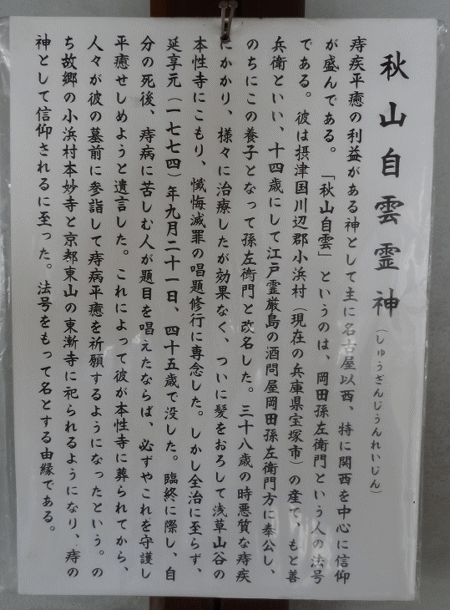 ■妙見堂(妙見宮、鳥辺山妙見大菩薩) 痔の神様である秋山自雲が、妙見堂境内の右側にある祠の中のお墓があります。お墓には、「秋山自雲神霊」と刻されています。 「昭和京都名所圖會」竹村俊則著 駸々堂出版 一九八九年七月十日第三刷発行には、次のように記載されています。 「【妙見堂】は(通妙寺の)隣の本寿寺をへだててさらにその東にあり、通妙寺の別所となっている。俗に「鳥辺山の妙見」とよばれ、境内にある舞台造りの絵馬堂からの眺望はよく、参詣者の興味を引く。傍の十三重石塔(南北朝)は鳥野辺墓地の遺物と思われ、秋山自雲居士しゅうざんじうんこじ墓痔疾平癒祈願の信仰がある。」 ただし、「現在、妙見堂と通妙寺は、関係なくなっています。妙見堂は鳥辺山妙見堂智積院といい、明治の廃仏毀釈の時に通妙寺から独立しました。(中略)本堂の裏にある秋山自雲の墓は、東漸寺から分祀されたもののようですが、分祀の年代などについても詳細は不明です。今も沢山の人が、秘かにお参りにこられるということです。」とあります。「京の民間医療信仰」奥沢康正著 思文閣出版 1991年4月20日発行
