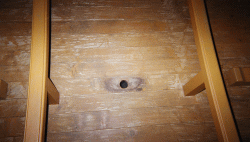 ふかし湯の板の間。直径4センチ程の丸い穴が空いていて、ここから蒸気が上ってくる仕組み。穴の上にバスタオルを敷き、痔の場合は穴にちょうどお尻があたるように、浴衣のままで横になる。当たり前ですが、痔でない場合は患部にあてるということになります。 |