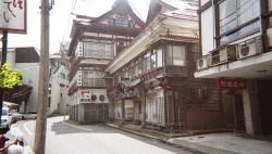 湯前神社の前が共同浴場。奥が二大老舗である瀬見グランドホテル観松館と喜至楼別館がある。(略)効能は、神経痛、リウマチ、火傷、婦人病、皮膚病などに飲用として胃腸病、便秘となっている。