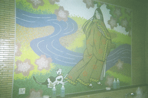 浴場は、大浴場と露天風呂が男女各ひとつある。露天風呂は、大浴場の奥にある。浴場のタイル壁には、和泉式部と猫が描かれている。この和泉式部と猫の図柄は、少し異なるものもあるが、外の看板、建物の壁、お土産の包装紙など、あちこちに使われている。